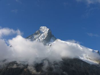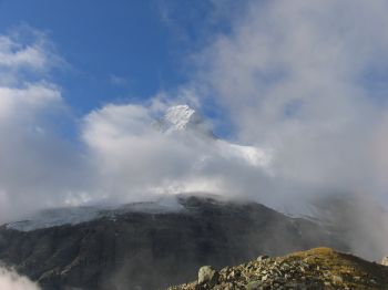 | Die Hütte liegt bereits hinter uns. Wir kommen gut voran und der Himmel klart immer länger auf, so dass wir nun sehr oft das Matterhorn von der anderen (westlichen) Seite sehen können. | |
