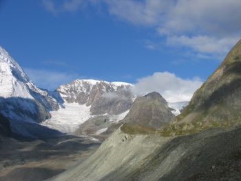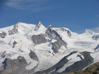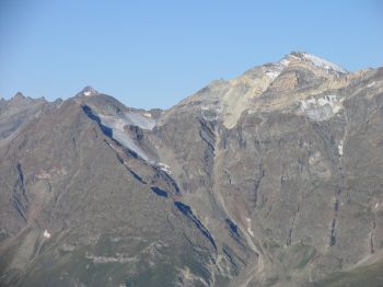 ![]() Die Sonne drückt, der Blick schweift zur Monte Rosa Gruppe, Breithorn und Kleinem Materhorn. |