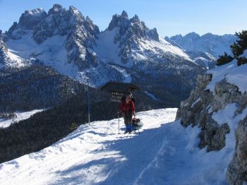 | Dann geht es am Morgen nach dem Packen mit den Pulkas auch schon los. Da zum Jahreswechsel 2006/2007 nicht ganz so viel Schnee lag und die Motorschlitten oft fahren, ist der Weg mit den Schlitten nicht ganz so beschwerlich. Start ist am Parkplatz (WoMo-Stellplatz Misurina) in 1757 m Das Wetter ist super, die Temperaturren liegen bei etwa -5°C. |