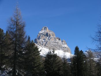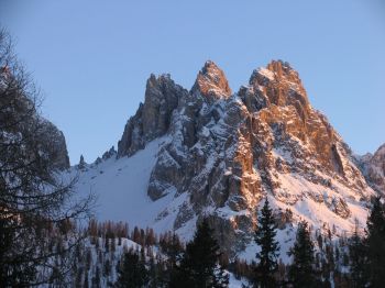 Eigentliches Ziel war in den bisherigen zehn Silvesterbesuchen an den Drei Zinnen, diese im Winter zu umrunden. Dieses Ziel wurde noch nicht erreicht. Die Gründe reichen vom schlechten Wetter wie Schneefall, dichter Nebel, Lawinengefahr oder einfach nur zu spät los bis zum Abbruch. Trotzdem war es immer ein super Wintererlebnis. Hier vom Ausgangpunkt am Lac Antorno mit Blick auf die Drei Zinnen von Süden und der Cadini-Gruppe von Westen am Abend. Im Iglu gibt es offenes Feuer, ausreichend Grappa und auch ein Imbiss. |
