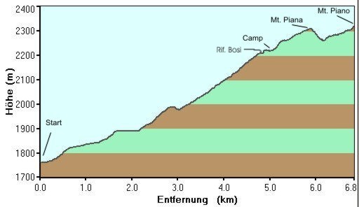 Das Anstiegsprofil von Misurina bis zum Monte Piano.