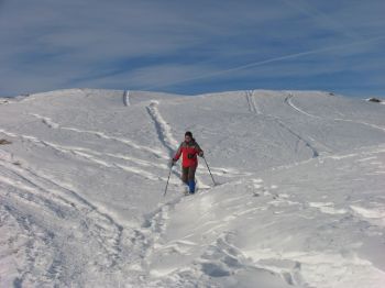Talwärts mit Schneeschuhen und dann ziemlich genau in der Bildmitte ist das Zelt auszumachen.