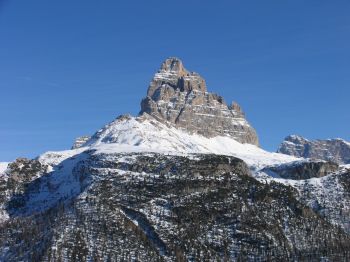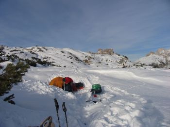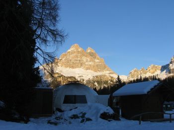 Eigentliches Ziel war in den bisherigen zehn Silvesterbesuchen an den Drei Zinnen, diese im Winter zu umrunden. Dieses Ziel wurde noch nicht erreicht. Die Gründe reichen vom schlechten Wetter wie Schneefall, dichter Nebel, Lawinengefahr oder einfach nur zu spät los bis zum Abbruch. Trotzdem war es immer ein super Wintererlebnis. Hier vom Ausgangpunkt am Lac Antorno mit Blick auf die Drei Zinnen von Süden und der Cadini-Gruppe von Westen am Abend. Im Iglu gibt es offenes Feuer, ausreichend Grappa und auch ein Imbiss. |