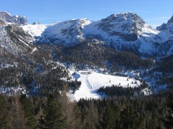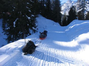 | Dann geht es am Morgen nach dem Packen mit den Pulkas auch schon los. Da zum Jahreswechsel 2006/2007 nicht ganz so viel Schnee lag und die Motorschlitten oft fahren, ist der Weg mit den Schlitten nicht ganz so beschwerlich. Start ist am Parkplatz (WoMo-Stellplatz Misurina) in 1757 m Das Wetter ist super, die Temperaturren liegen bei etwa -5°C. |