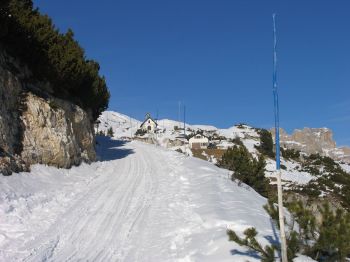 | Aber der Weg führt uns nicht wie früher direkt unter die Drei Zinnen, sondern auf den Monte Piano. Natürlich im Glauben, dass dort keine Touristen zu finden sind. In den vergangenen Jahren war dort auch niemand zu entdecken und Motorschlitten fuhren auch nicht dort hinauf. Nun kann man sich wie zur Auronzo-Hütte auch zur Rif. Bosi für 15 EUR hochfahren lassen. |