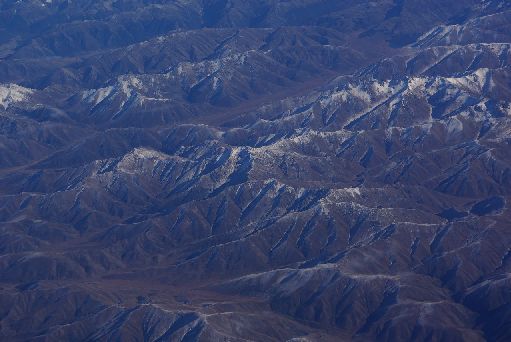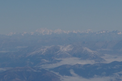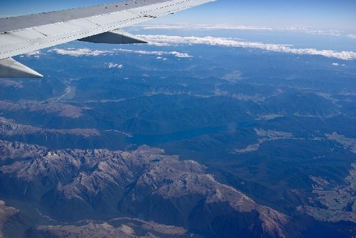 | Flug zur Südinsel bei schönsten Wetter und bester Sicht. Der erste Blick auf die Southern Alps und das was mich die nächsten zwei Wochen beschäftigen wird - Auf- und Abwärts. Der Blickwinkel des Flugzeugs macht die geringe Bevölkerungsdichte glaubhaft (etwa 14Menschen/m², Zahlen über Schafe und Opossums hab ich leider nicht parat, sollen jedoch weit höher liegen). Es ist schon richtig Herbst und hat schonmal geschneit dieses Jahr (02. April 2009). |
