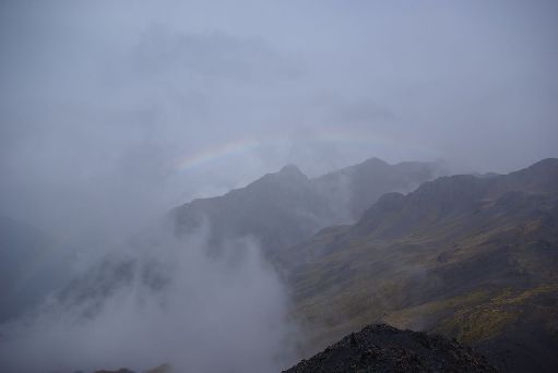 | Am Sonntag sind wir ins Arthur's Pass Village gestartet. Die Busfahrt (kleiner Shuttle Bus mit vielleicht 25-30 Plätzen und Anhänger) war recht zügig. Ich fand's beinahe zu zügig, aber der Busfahrer schien die Strecke mit allen Kurven und einspurigen Brücken zu kennen. Wir wurden von genau Null Autos überholt, verwunderlicher Weise haben wir kein Auto mit dem Bus überholt. Die erste Tour ging auf den Avalanche Peak (1833m). Nachdem der Regen schon bei unserer Ankunft einsetzte bekamen wir wenigsten einen Regenbogen zu sehen, nachdem es wieder etwas aufklarte. Nass waren wir trotzdem. |