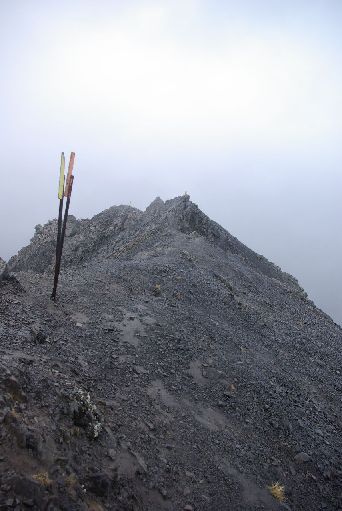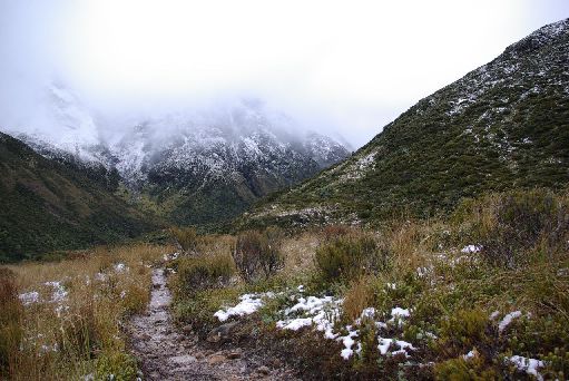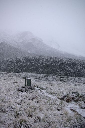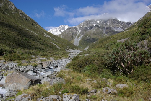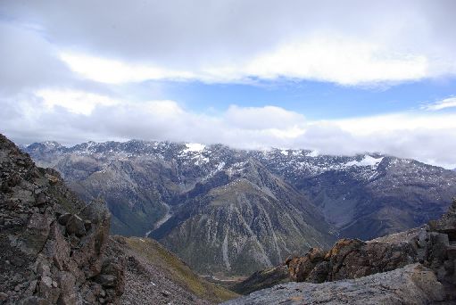 | Avalanche Peak (1833m), war unser erstes Ziel verregnetes Ziel gewesen. Sieht gar nicht so schlimm von hier aus. Jedes Jahr (leider schon im Februar gewesen) findet ein Rennen über 26km vom Arthur's Pass Village auf den Gipfel, herunter ins hintere Tal und zurück statt. Die Besten brauchen weniger als eine Stunde für die ersten 1000 Höhenmeter zum Gipfel. Der Jäger, der uns von der vorletzten Tour mitgenommen hatte, meinte dass er heute nicht mehr mitmacht, auf seine Knie verweisend. Der Weg nach Temple Col war der Beginn unserer letzten Zweitagestour. |