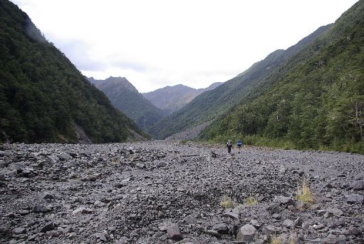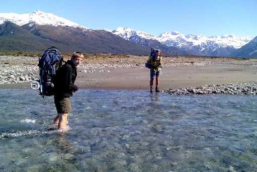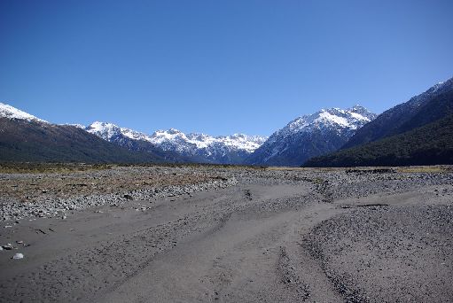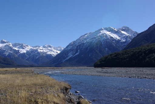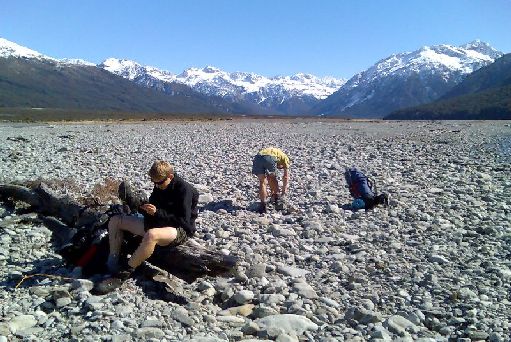| Schier endloses Flusstal des Waimakariri Rivers. Die Nächste Hütte liegt etwa noch drei Stunden entfernt. Bis auf den Fakt, dass der Rucksack besonders schwer war, ein entspannter Tag. Da dies der Beginn einer vier Tageswanderung war, planten wir für mindestens fünf Tage Essen ein, was sich auch als sinnvoll herausstellte. Übrigens keine abgepackten Trockensachen, das liegt den Neuseeländern Gott sei dank nicht so sehr. Abends gab es immer Pasta oder Reis mit möglichst frischem Gemüse, Soße, Fleisch oder Fisch. Unterwegs empfehlen sich Nüsse und eine Art Kekse mit Aufstrich oder Käse. Einer aus dem Verein ist bekannt für seine gewagten Kreationen. Sein offizieller Tipp lautet: Nutella, Erdnussbutter, Käse und Salami auf einer Scheibe Cabin Bread - damit Kohlenhydrate, Fette und Eiweiße in einen (siehe Photo von der Vereinswebseite des Tramping clubs). Ich hab mich dann immer auf Brot und einen Aufstrich beschränkt. |