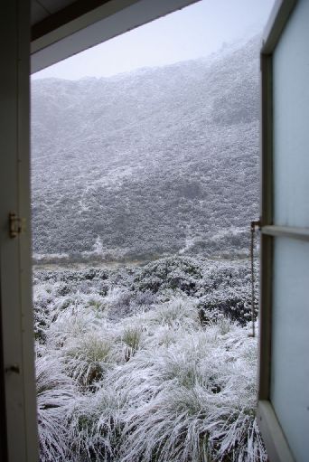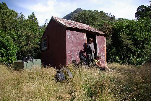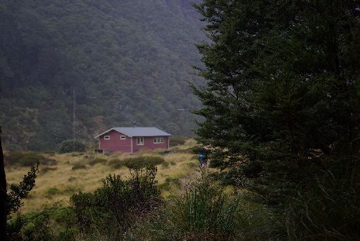 | Die erste der Hütten, die wir genutzt haben (in Neuseeland gibt es insgesamt über 950 im ganzen Land verstreut): Edwards Hut. In den 60er Jahren erbaut und ziemlich gemütlich. Eine Übernachtung kostet NZ$15 (ungefähr 6€), wenn man keinen Jahrespass hat (NZ$90 für ein ganzes Jahr für fast alle Hütten). 10 Minuten nachdem wir angekommen waren setzte heftigerer Regen ein. Zwei Schweden hatten zum Glück schon Feuer gemacht. |