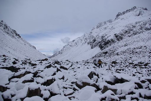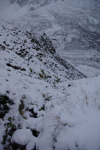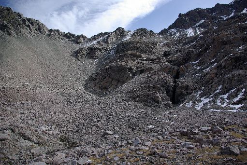 | Blick zurück zum Pass (etwas links von der Mitte). Dankbarer Weise war der Hang zum runter rutschen geeignet. Nicht das was man seinen Schuhen wünscht dafür 10mal schneller als bergauf gehen. |