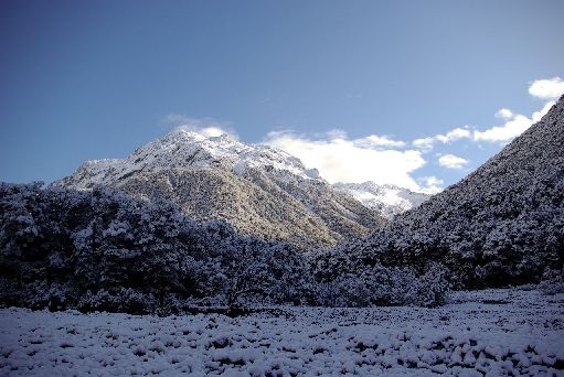 | Schöner Kontrast der schneebedeckten Gipfel zum Tal. Ende der ersten Dreitages plus Regentags Tour. |