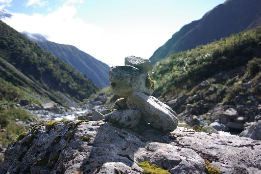 | Aoraki/Mt Cook, der Höchste Berg Neuseelands, 3754m. Vor ein paar Jahren sind etwa 10m vom Gipfel abgerutscht, was nachweislich etwas vom Stolz der Neuseeländer gekostet hat. Konnte am 1. Weihnachtstag 1894 erstbestiegen werden. Auch Sir Edmund Hillary trainierte hier. Etwa 7.6m Regen bzw. Schnee pro Jahr in dieser Region, damit nicht ganz die Regenreichste Region Neuseelands (weit über 10m pro Jahr). Die Gletscher in diesem Gebiet wachsen nach 100 jähriger Rückzugsphase wieder um etwa 3m pro Woche (Fox Gletscher) bzw. rund 80m pro Jahr (Franz-Josef Gletscher). |