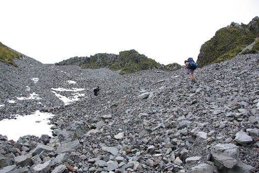 | Das letzte Stück zum nächsten Pass vom Dry Creek aus (Creek ist ein Bach), der gar nicht so trocken war. Das erste Stück verlief mehr oder weniger im Bach über teils recht große Felsen. Der Pass war zwar nur rund 1400m hoch, der Ausgangspunkt jedoch 1000m tiefer. Man gewöhnt sich langsam an das Gewicht des Rucksacks. Außerdem hat man immer die Hoffnung, es kann jetzt eh nur noch besser werden. Naja, mit dem letzen Teil hatte keiner gerechnet. Kurz vor der Hütte mussten wir noch durch ein Stück Busch - ohne Weg. Sowas kostet immer viel Zeit und Kraft. Da am darauffolgenden Tag das Wetter zu verregnet war (schlecht, wenn man auf eine Mitfahrgelegenheit hofft - wer nimmt schon nasse Wanderer mit?), konnten wir uns zumindest ausreichend erholen. Zum Glück wurde immer vorsichtig kalkuliert. Man beachte die äußerst praktische und typische Wanderkleidung: schnelltrocknende Shorts. |