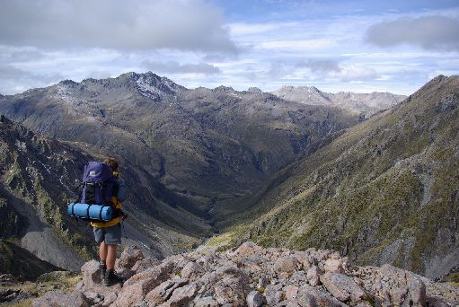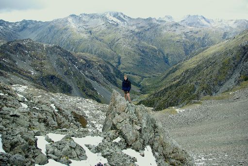 | David blickt zum Ziel des Tages, Goat Pass im linken Tal verborgen. Auf dem Rückweg war es Anfangs zum einen extrem Windig, dass man fast vom Weg umgeblasen wurde. Dann fing es an zu regnen. Daher habe ich auch keine Photos vom letzten Tag. Letztendlich kamen wir gerade zur richtigen Zeit zurück ins Dorf. Später schwollen die Flüsse wieder ziemlich an. In der Nähe wurden Regengüsse von mehreren Hundert (!) Litern pro Quadratmetern gemeldet. |