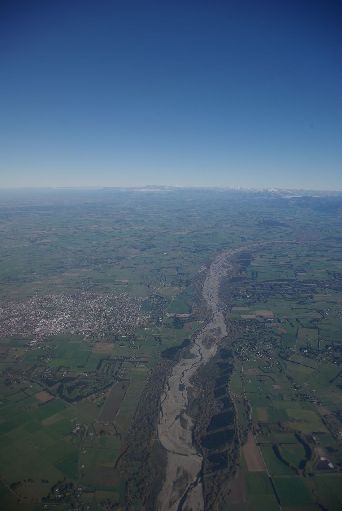 | Rückflug zur Nordinsel bei schönsten Wetter und bester Sicht. Eins der Flusstäler, wie wir sie durchschritten, vom Flugzeug aus. Wohl der Waimakariri River. Die Flusstäler können Kilometerbreit sein, bei Niedrigwasser aber nur mehr ein flaches Tal als Fluss. |