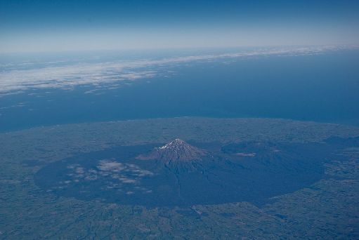 ![]() Mt Taranaki (2518m, North Island): Grenze des Nationalparks (grüner Baumgürtel) ist etwa eine Höhenlinie (400m). Auf der Spitze der erste Schnee des Jahres. Wichtig: Der Normalweg ist auf der Nordseite, den dort scheint hier die Sonne mittags. Ähnlichkeiten zum Mt. Fuji sind nicht zu verleugnen. Viele japanische Touristen im Flugzeug waren begeistert von der Aussicht! Mehr im Abschnitt Mt. Taranaki. |