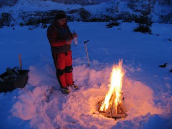Es war vorauszusehen, dass unser Holzvorrat nur knapp zwei Stunden reichen würde. So sind wird erst einmal in den Schlafsack, um dann zu Mitternacht das Feuerwerk im Tal zu beobachten.