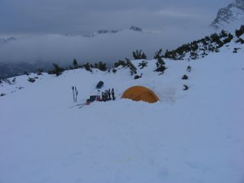Talwärts mit Schneeschuhen und dann ziemlich genau in der Bildmitte ist das Zelt auszumachen.