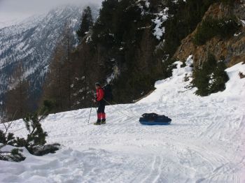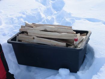 Die Anstrengungen des Transportes sollen nun belohnt werden. Thüringer Holz, selbst gefällt und gehackt und dann mit dem Pulka nach oben gezogen.
